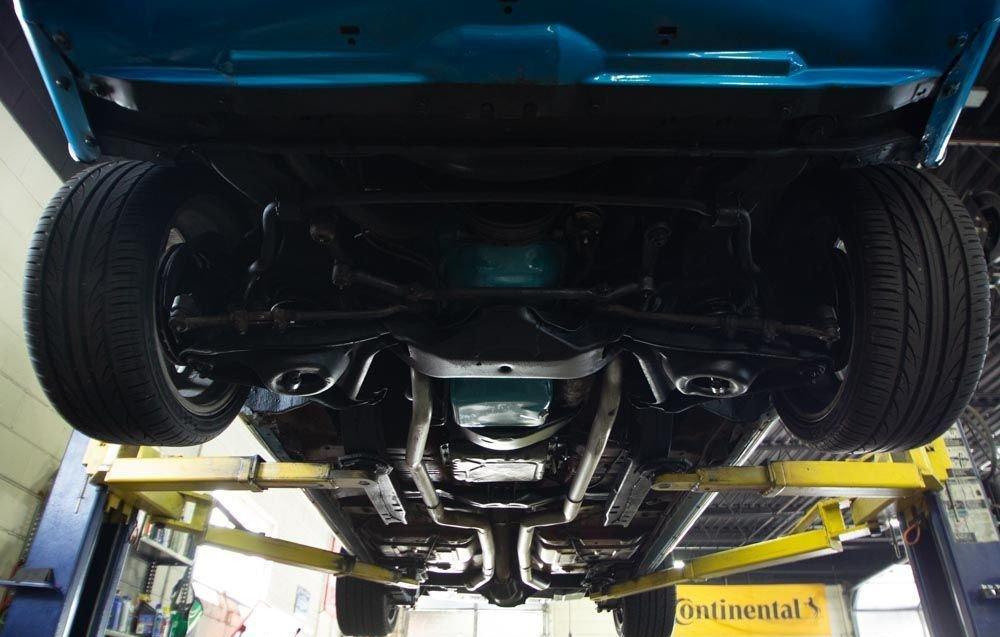 This Firebird Esprit looks fantastic in its original Lucerne Blue over Blue color combination. The paint has a deep shine, the chrome and brightwork show well, and the body has a smooth finish. The car rides on 18 inch US Mags with 235/35R18 front and 285/35R18 rear tires that have about 90 percent tread. The stance is excellent thanks to being slightly lowered. The underside is clean with solid spring mounts, rockers, and lower quarters. A few small blemishes are present such as faint bubbling near the rear tail lights and a minor crack in the left sail panel, but nothing noticeable from several feet away.