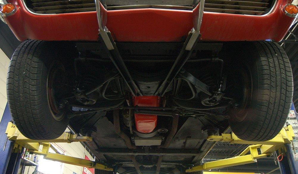 Finished in vibrant Red, the exterior is in excellent driver condition with a deep, glossy shine. The true knock-off wheels with real spinners are in brilliant condition, paired with nearly new white wall tires (205/75R15). The soft top is in excellent shape, and the rear window is clear. Minor touch-ups, chips, or small blemishes are present but are not noticeable from a distance. The underside of the car is very clean, with detailed photos highlighting areas prone to rust.